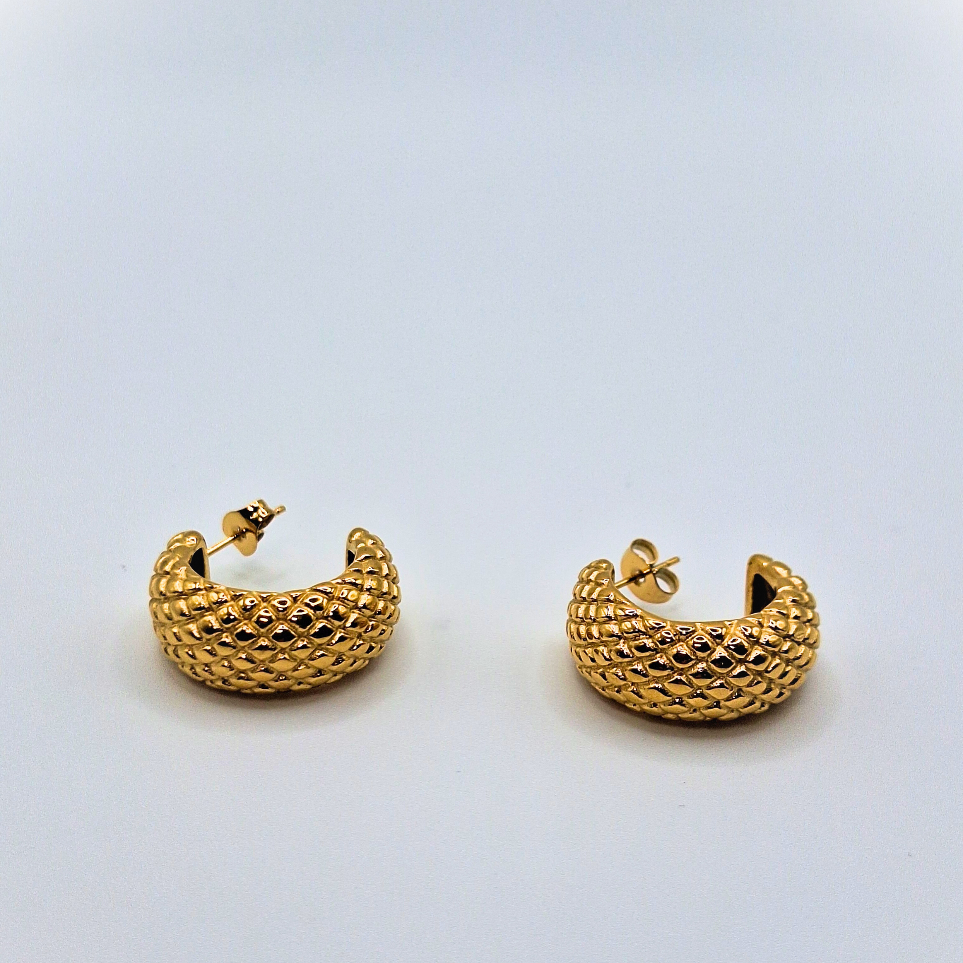 Delicate yet eye-catching, these 2.5 cm hoops have a beautiful textured surface that softly reflects the light. Made from gold plated stainless steel, they’re light to wear and easy to style – just as perfect with jeans and a T-shirt as they are with a blazer or evening dress. A simple everyday favourite that still feels special.