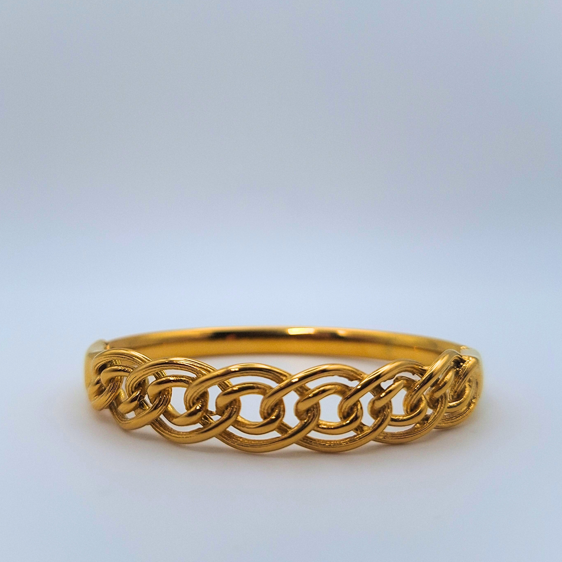 A sleek cuff bracelet in gold plated stainless steel, finished with a front panel of interlocking links that sit smoothly against the wrist. It has a polished, slightly chunky feel that works with everything from soft knits to tailored shirts and evening looks, adding a quietly bold, golden accent.