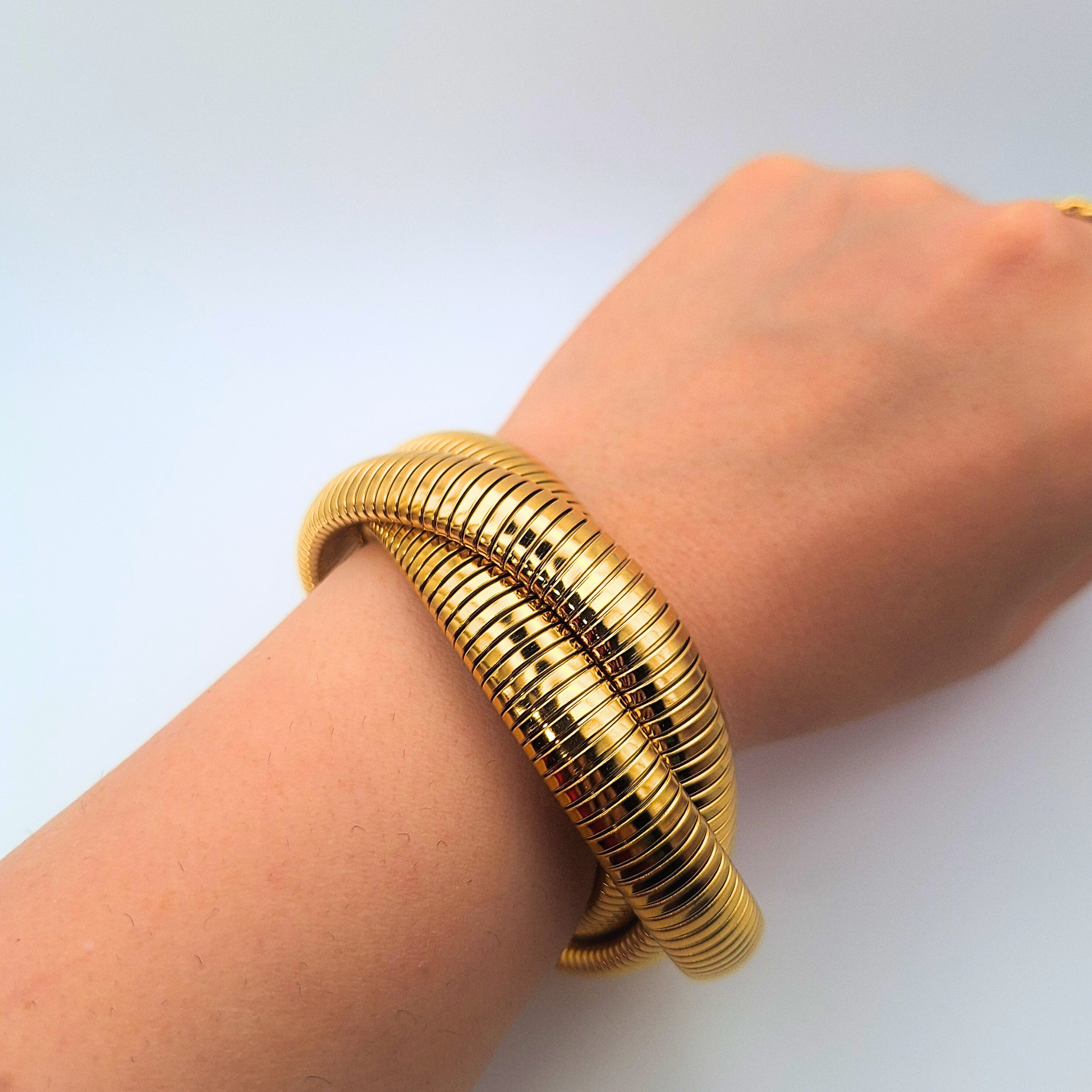 Three shiny gold plated stainless steel coils hug the wrist for a sculptural, statement look. It’s the kind of bracelet that instantly dresses up a plain tee, looks chic with a blazer and adds a bit of drama to evening outfits – no layering required.